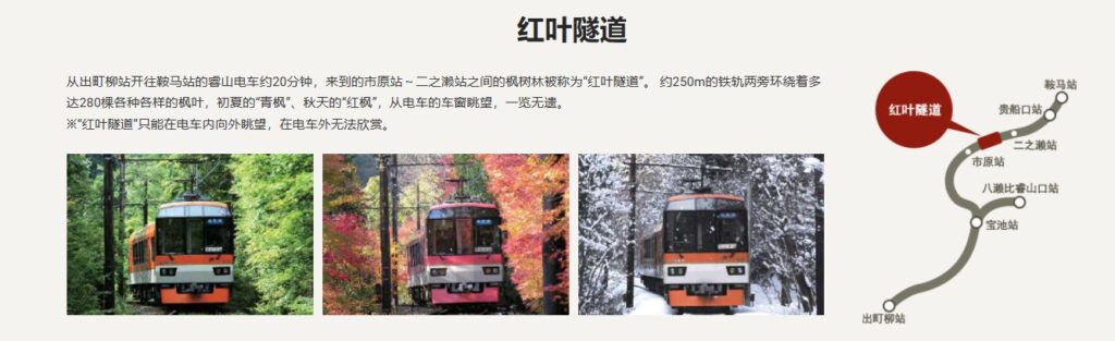 为庆祝秋季红叶季节,叡山电铁将在鞍马线市原站与二之濑站之间的“枫叶隧道”区间内实施减速运行。