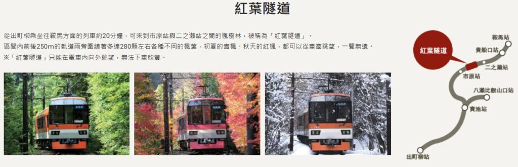 為慶祝秋季紅葉季節,叡山電鐵將在鞍馬線市原站與二之瀨站之間的「楓葉隧道」區間內實施減速運行。
